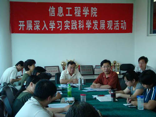 5月26日 ,信息工程学院党总支按照校党委相关文件部署,组织全体党员召开了学习实践科学发展观活动“转段”动员大会,提出 信息工程学院分析检查阶段的两点思路 : “广开言路” 汇集“民情民意”;“辨证施治”为学院发展“把脉”、“诊断”、“开方”。