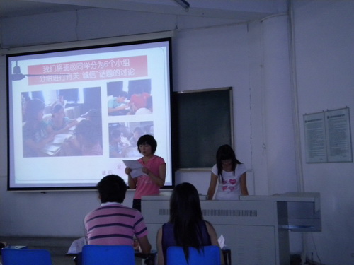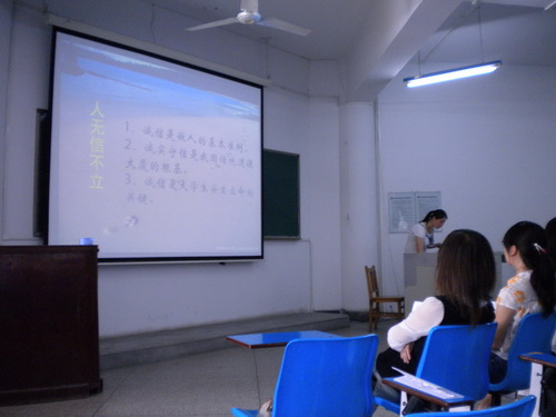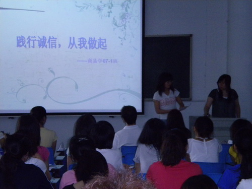 在前两个阶段, 06 、 07 、 08 级各班级同学们积极参与,认真准备,以各种形式有针对性地对当今大学生周围存在的不诚信现象进行广泛的调查、讨论,并分析原因,提出对策,形成班级总结材料。学院选取七个班级从大学生的信仰诚信、经济诚信、学术诚信、就业诚信和网络诚信等方面交流汇报,提出大学生诚信标准。交流活动中,同学们播放了采访周围同学、请教PP电子 “诚信教育”课主讲老师的 DV 短片和生动有趣又富含教育意义地案例视频,与现场同学讨论互动。在轻松愉快的氛围中,同学们围绕自己对诚信人生的理解,解读诚信标准的要求,使全体学生干部受到了深刻的感性教育,达到了预期效果。