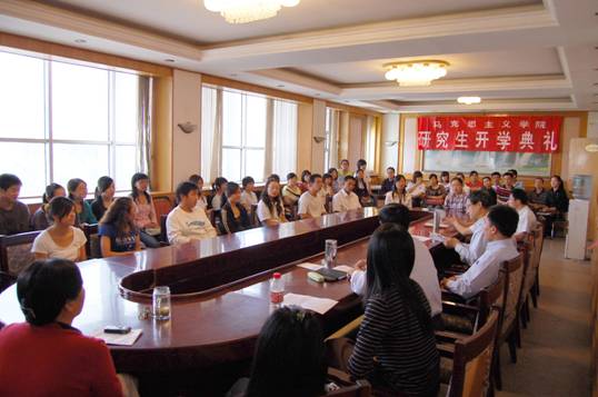 9 月 10 日 下午, 2009 级研究生开学典礼隆重举行。 马克思主义学院迎来了 31 名硕士研究生。研究生部副主任赵建洪和马克思主义学院研究生导师、各教研部主任、 08 级研究生出席了开学典礼。