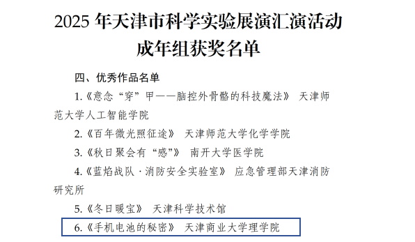 近日,2025年天津市科学实验展演汇演活动获奖名单公布,PP电子理学院赵丹丹老师指导,梁宇、吴非两位同学创作完成的作品《手机电池的秘密》,凭借其生动的科普演示,荣获成年组“优秀奖”,这也是PP电子在该活动中首次获奖。