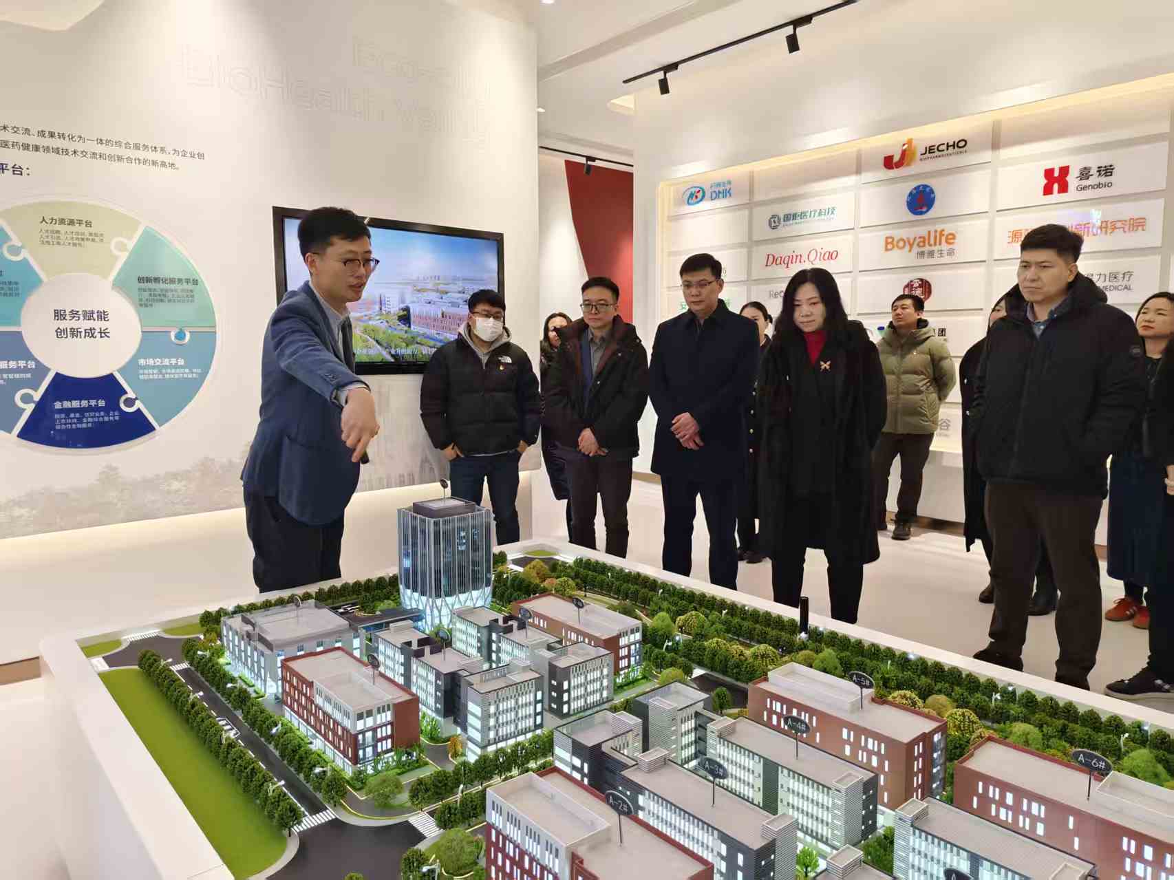 聚焦天津科技创新和产业创新,学院及大健康协同创新研究院党员们首先参观了中新天津生态城开发建设15周年展,在讲解员的带领下,了解生态城在智慧城市建设方面的经验和突出成果。随后,前往生态城生命健康谷,参观生物医药产业园展厅和企业,了解大健康产业创新优势和发展战略定位。最后,与中新天津生态城教体局、天津生态城产业园发展有限公司领导及党员代表开展座谈。座谈方就产教融合、大健康发展前景、语言服务、中外合作办学等方面交换了意见,为今后加强与产业园的合作,开展校企联动打下了基础。