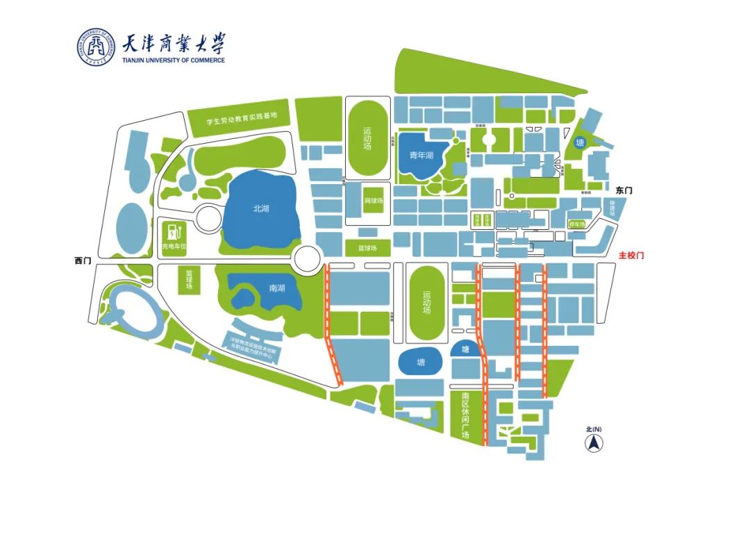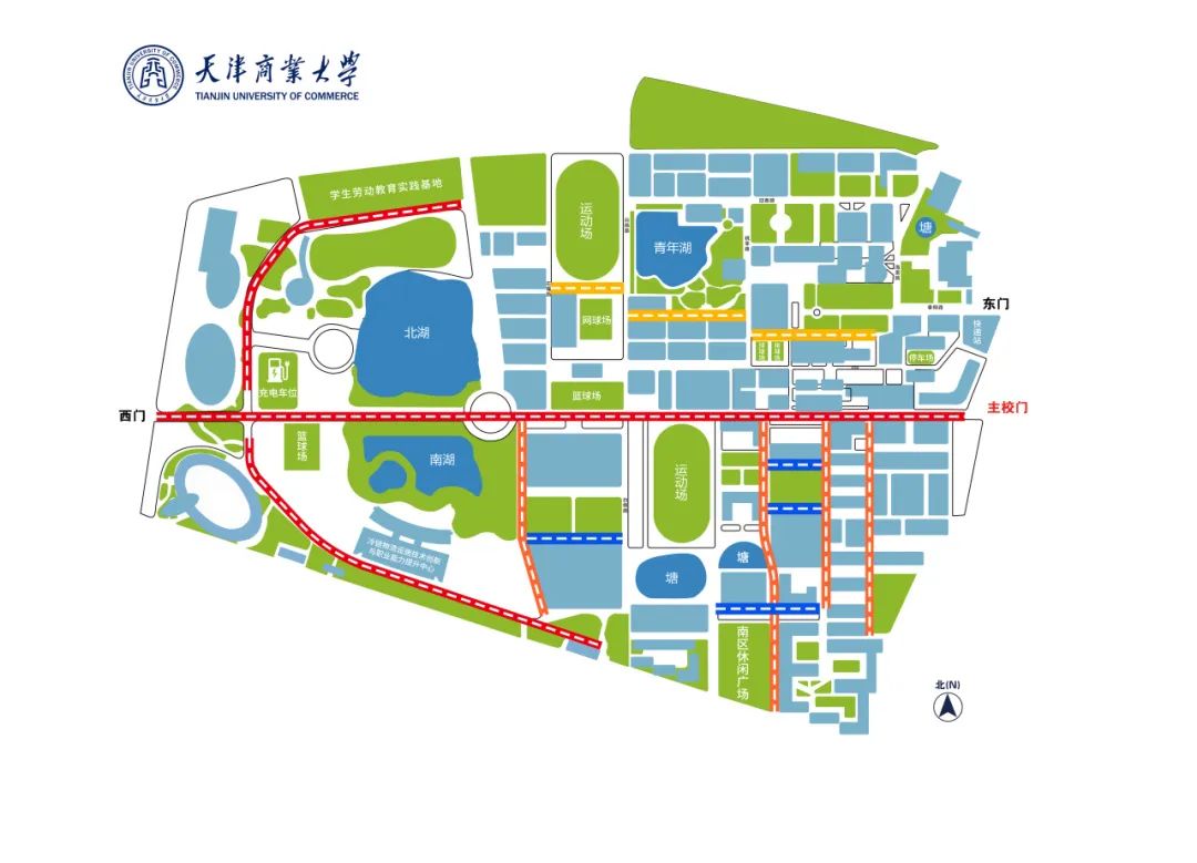 道路贯穿主校门至西门,在西门南北方向延伸,途经图书馆、南北湖、国际教育交流中心、冷链物流设施技术创新与职业能力提升中心、体育馆、学生劳动教育实践基地(天商农场)等区域。