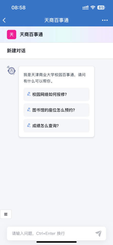 为深入贯彻落实学校第三次党员代表大会提出的“数智赋能战略”要求,全面推进学校教育数字化转型和高质量发展。近期学校基于DeepSeek-R1/V3(671B)大语言模型技术,依托本地化智能体平台创建学校专有知识库,开发了“天商百事通”应用。该应用提供了学校管理规范、办事流程、信息查询等场景的智能问答服务,旨在为师生提供便捷化、精准化、智能化的校园服务。