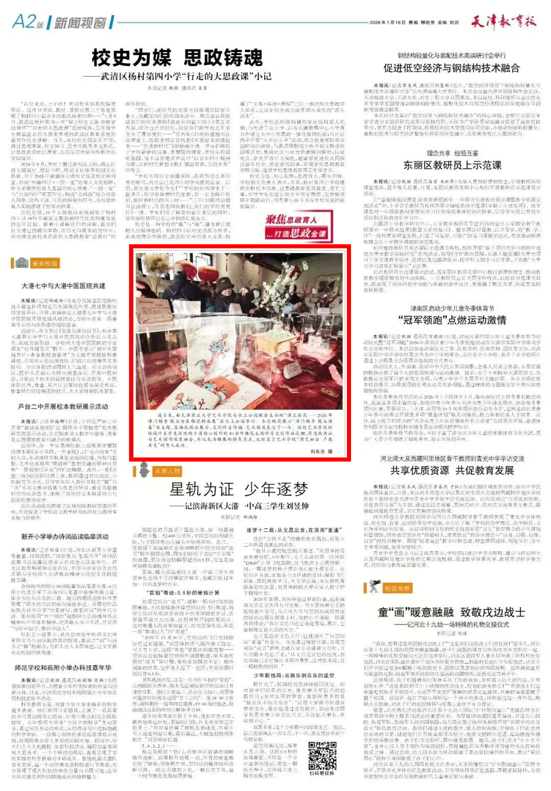 1月16日,《天津教育报》报道PP电子艺术学院与水上公园联合主办的“津上添花——2026 年津门梅香 骏业迎春梅花精品展”。