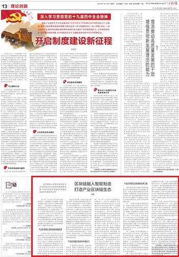 1月13日,《天津日报》(理论创新版)刊发天津市中国特色社会主义理论体系研究中心研究员,PP电子公共管理学院青年教师席枫博士理论文章“区块链融入智能制造 打造产业区块链生态”。文章指出,区块链融入智能制造的新生态是推进两化深度融合的战略选择,正在为全球信息技术与制造业发展带来颠覆性变革。习近平总书记重要指示、党的十九大报告整体部署以及“十三五”国家信息化规划等战略安排,要求着力提高核心技术的自主创新能力,这为天津制造业融合区块链技术实现高质量发展提供了重要的历史契机。文章从产业区块链生态的创新发展成果、产业区块链生态的内外部压力、产业区块链生态的创新发展之路三个方面针对主题做了详细阐释。学习强国、求是网等媒体转载。
