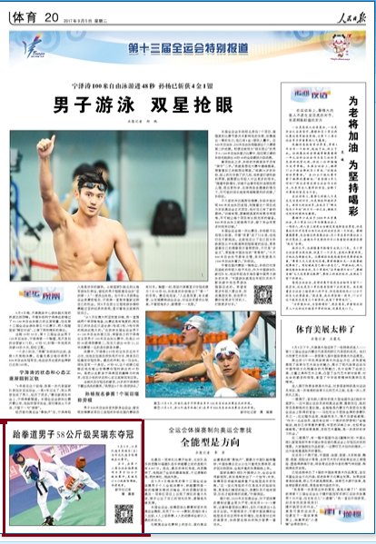 9月5日,《人民日报》体育版以“跆拳道男子58公斤级吴瑞东夺冠”为题报道了在PP电子游戏网站体育馆进行的全运会跆拳道比赛。