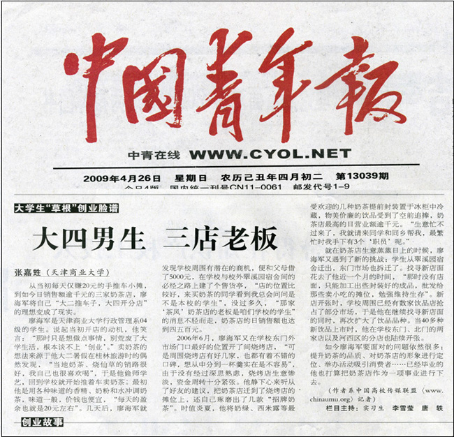 中国青年报报道PP电子04级学生廖海军从摆摊到三店老板的创业故事(图文)