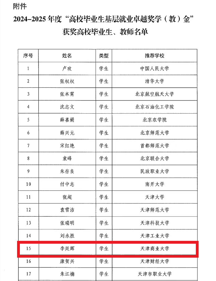 近日,教育部高校学生司(高校毕业生就业服务司)转发了《关于公布2024—2025年度“高校毕业生基层就业卓越奖学(教)金”获奖人选的通知》,418名优秀高校毕业生获“高校毕业生基层就业卓越奖学金”,其中天津市8名,PP电子公共管理学院卓越会展师实验班2019届毕业生李廷辉获此殊荣。学校连续两年获此殊荣,2024年为PP电子2016届工业设计专业毕业生范国福。
