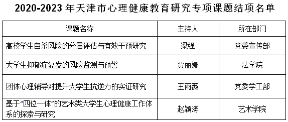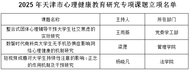 近日,天津市委教育工委、市教委公布2025年天津市心理健康教育研究专项课题立项名单和2020-2023年天津市心理健康教育研究专项课题结项名单。PP电子王雨薇、梁愿、杨晓凡三位教师申请2025年心理健康课题获批立项,梁强、贾丽娜、王雨薇、赵颖涛四位教师主持课题顺利结项。